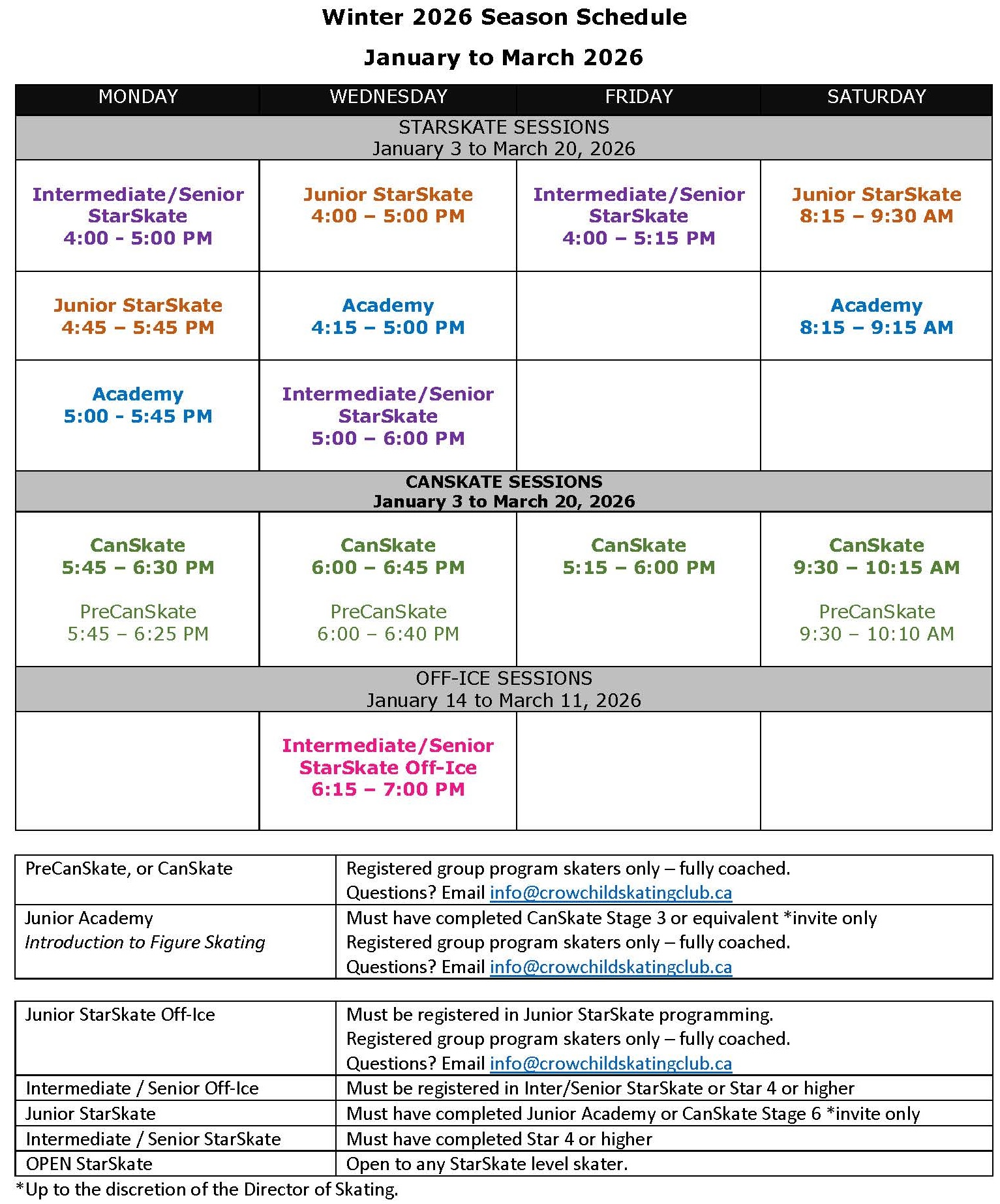 If you are new to the club and registering for CanSkate, please provide the results of your most recent evaluation in the comment section at check out. submit your most recent evaluation to info@crowchildskatingclub.ca